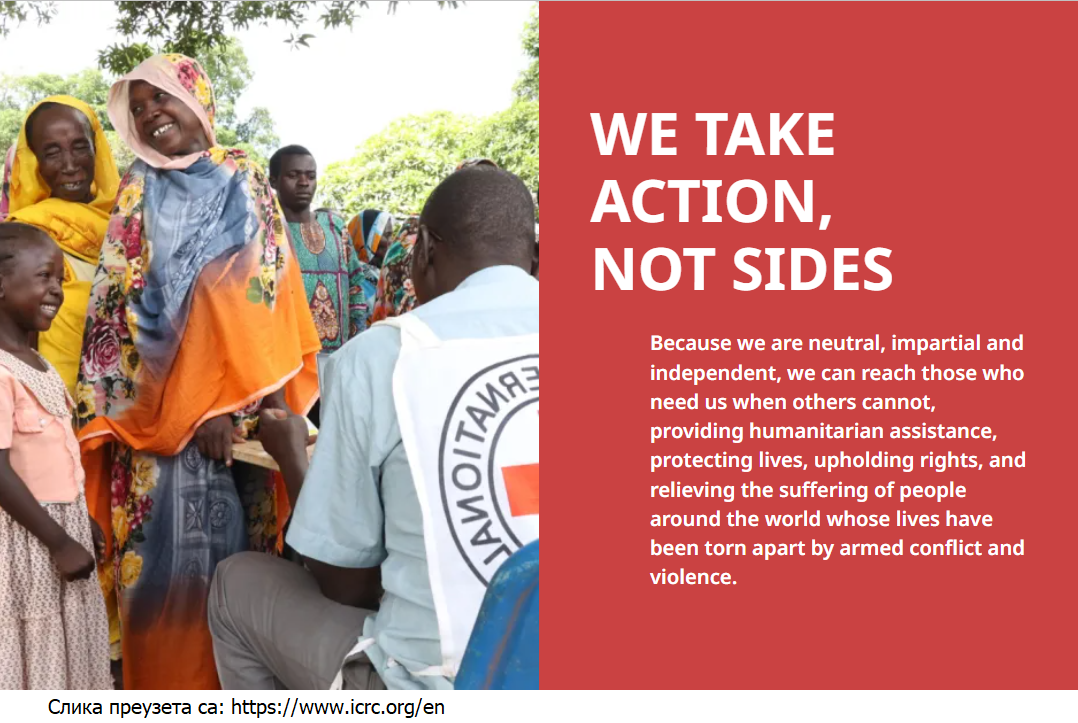 Он не прави никакву разлику према народностима, раси, верским убеђењима, класи или политичком мишљењу. Он настоји да ублажи страдање појединаца, руковођен само њиховим потребама дајући првенство најхитнијим случајевима несрећа.
